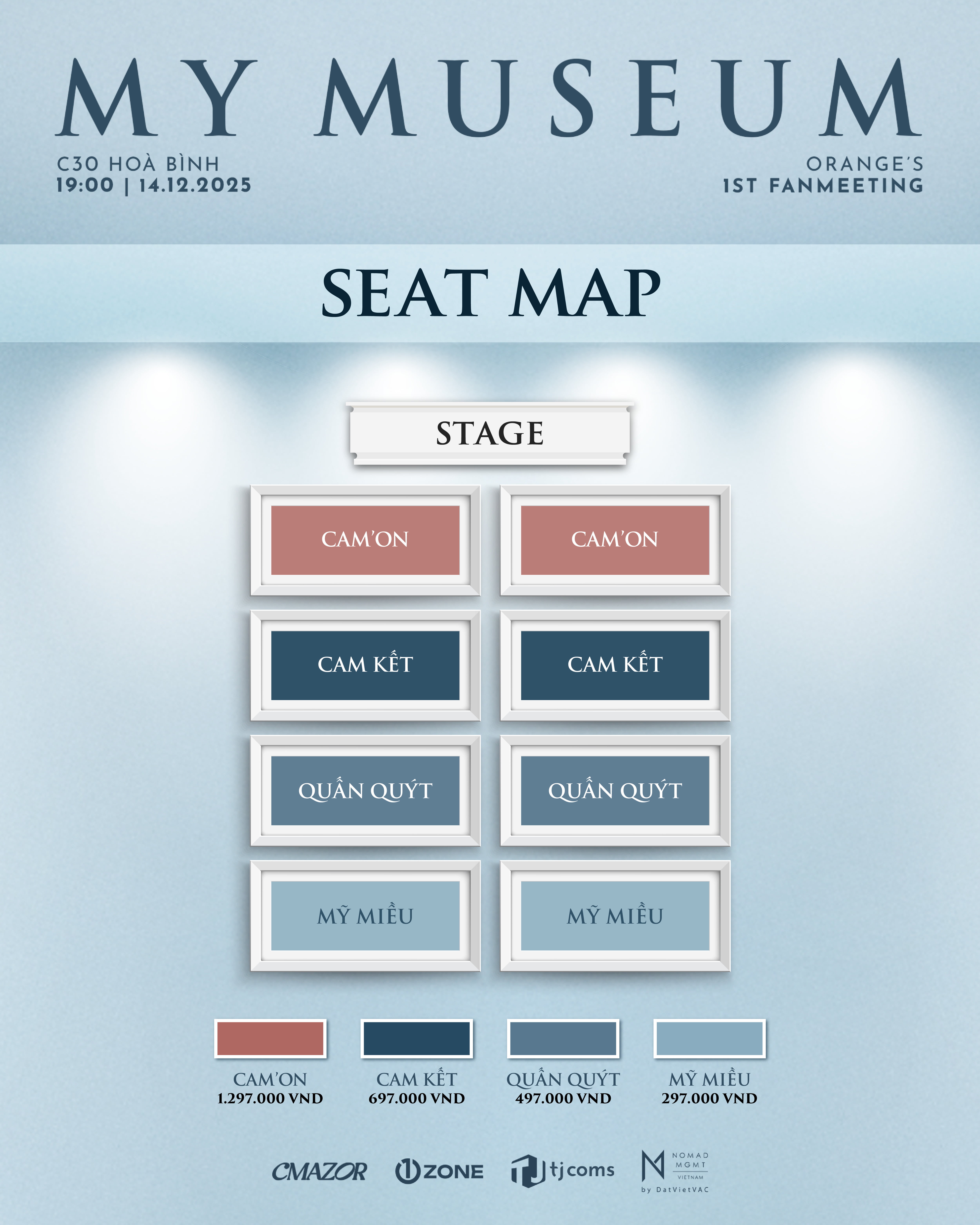 Vé bao gồm: Fansign (20 random); Photo 1:10; Soundcheck; T-shirt; Bandana; Tote Canvas; Signed Polaroid (20 random); 3 Photocard; Hi-Bye; Digital Signature Poster; Physical Ticket.